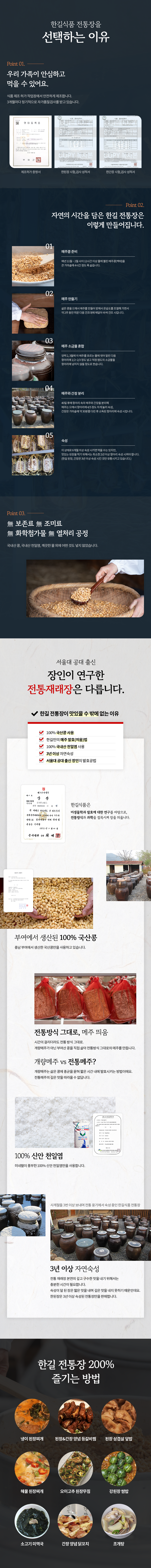 한길식품의 재래 된장과 간장은 인공 첨가물 없이, 단, 염도가 높을 수 있으니 기호에 맞게 적절한 양으로 조절하여 주시는 것이 좋습니다. |